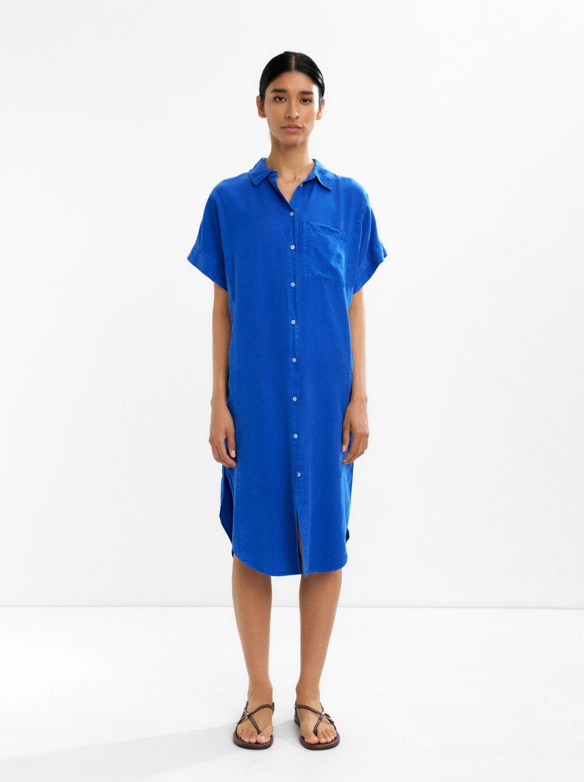 This 100% lyocell shirt dress in blue delivers a soft, breathable feel with a relaxed silhouette for effortless everyday wear. Designed with a timeless shirt cut and midi length, it transitions easily from casual outings to relaxed weekend styling. The solid blue tone ensures versatile pairing with sandals or flats, making it a staple for seasonal wardrobes. Comfortable and stylish, this dress blends natural fabric ease with subtle simplicity for everyday use.