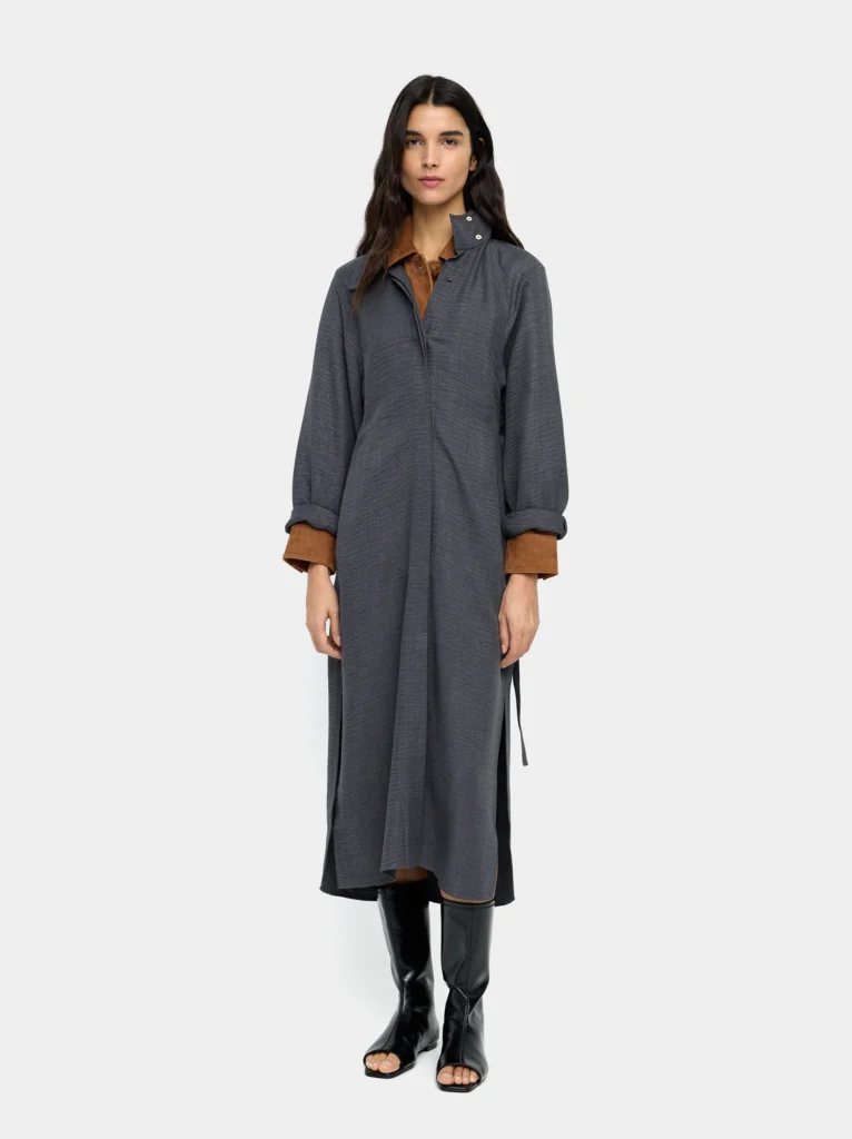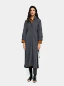 A refined midi with a subtle crinkled texture that lends depth and movement to the fabric. The high collar fastens with a neat button, while the main front opening features concealed buttons for a clean, uninterrupted line. Long sleeves provide coverage and balance the midi length, and an adjustable belt in the same fabric allows you to define the waist for a more tailored silhouette. This piece moves seamlessly from formal daytime events to evening engagements and is a versatile, elevated wardrobe staple for anyone who appreciates understated detailing and practical design.