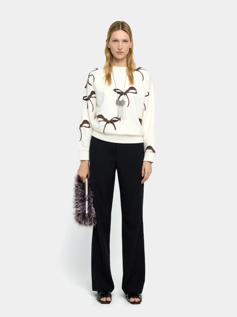 This soft cotton sweatshirt brings a playful yet elegant touch to everyday dressing with its delicate printed bow motifs. Designed with a classic round neckline and long sleeves, it features ribbed edges that enhance comfort while maintaining shape. The lightweight feel makes it ideal for transitional weather or casual layering. Whether paired with denim, leggings, or skirts, this sweatshirt balances charm and versatility, offering a polished look without compromising comfort