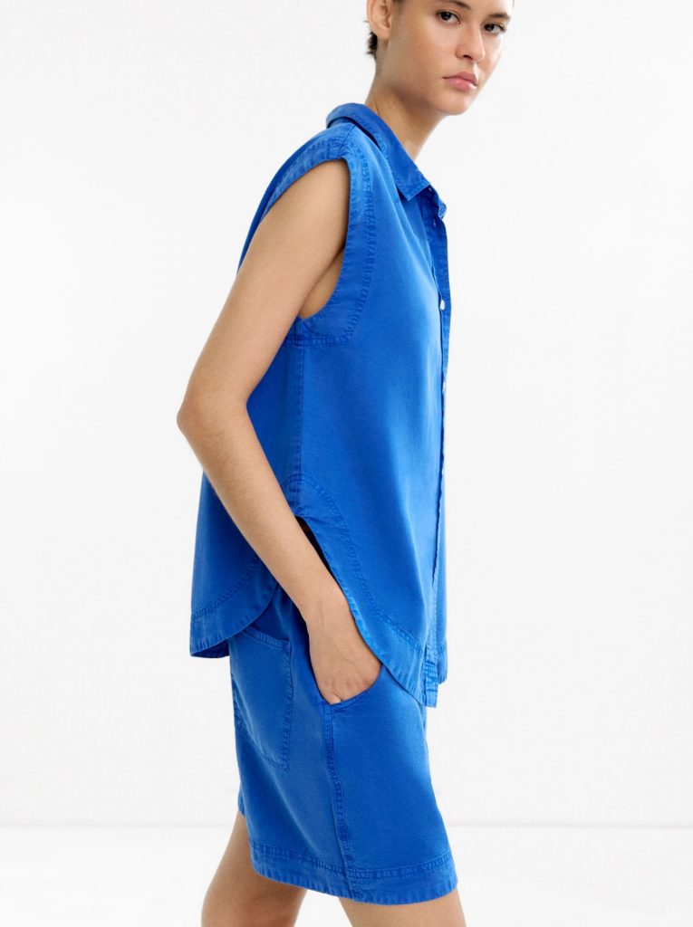 This sleeveless shirt is made from 100% lyocell, known for its silky touch and breathable performance. Designed with a clean neckline and fluid drape, it offers effortless elegance and comfort throughout the day. The calming blue shade enhances its versatile appeal, making it perfect for both casual styling and polished layering looks.