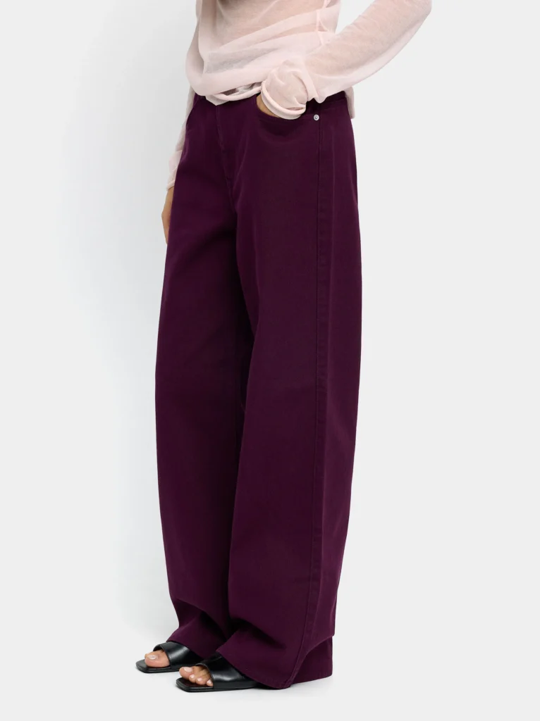 100% cotton denim trousers with a wide-leg straight cut and a single back pocket with topstitching detail along the leg. Finished with secure button-and-zip closure and belt loops, these trousers combine classic denim structure with contemporary proportion.