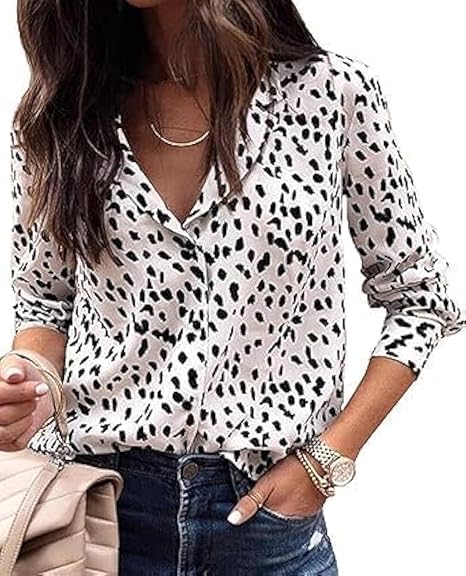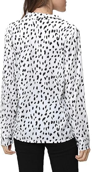 [Material]: The business casual blouse made of Polyester, chiffon feeling fabric and no stretch; very soft and comfy, close to skin [Features]: Dalmation print shirt for women, casual v neck, long sleeve, button down, lapel collar, trendy leopard print / polka dot print / solid color, relaxed fit [Occasion]: Elegant work blouse, with stylish printed pattern, perfect for work, business, office, date, cocktail, club, wedding, holiday, shopping or daily casual wear [Style]: Casual, elegant and cute style, this fashion leopard print top can be worn with denim jeans, skinny pants, shorts, boots and heels in Summer/ Fall/ Winter/ Spring