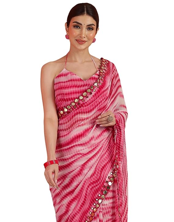 Material composition Georgette Occasion type Festival, Party, Wedding Pattern Printed Mirror Work Border Care instructions Machine Wash Country of Origin India Saree Details : Saree Fabric: Georgette| Blouse Fabric: Georgette | Saree Work: Printed, Mirror Work, Scalloped Border | Blouse Work: Printed| Saree Color: Pink| Blouse Color: Pink Saree Length : Saree: 5.50Mtr | Blouse: 0.80Mtr (Unstitched, Attached With Saree), What’s In The Package: A Georgette Traditional Saree With a Matching Blouse. Customizable Blouse Material: Comes With An Unstitched Blouse Piece, Giving You The Freedom To Tailor The Blouse According To Your Unique Style And Preference. | Perfect Gift For Special Occasions: A Timeless Piece, This Saree Makes An Excellent Gift For Weddings, Anniversaries, Birthdays, Or Festive Celebrations, Offering Both Tradition And Contemporary Flair.